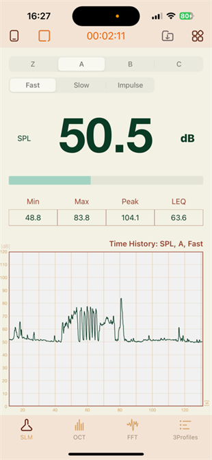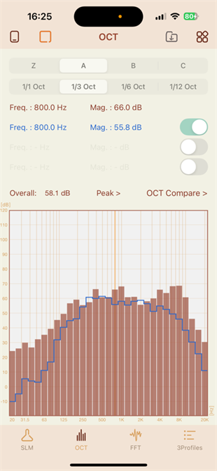 ? 倍頻程分析模式(OCT):支持 1/1、1/3、1/6、1/12 倍頻程分析,實時顯示 20Hz-20kHz 各頻段聲壓級,支持頻譜的能量平均及最大值保持,可對比最多 3 組歷史測試數(shù)據(jù)